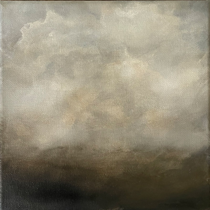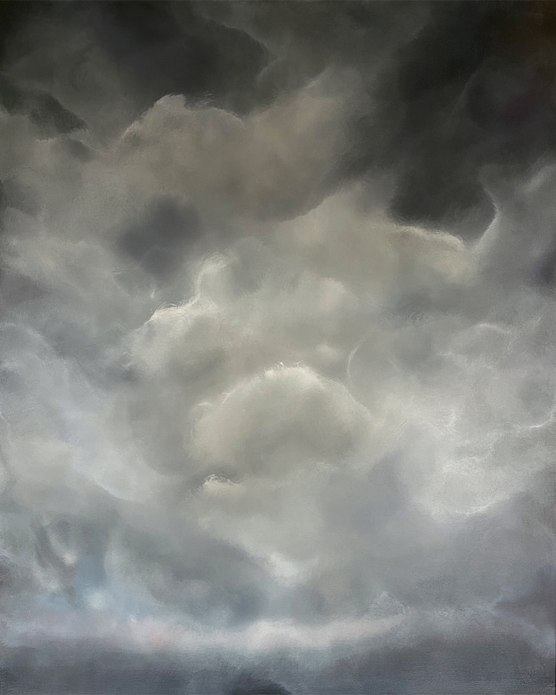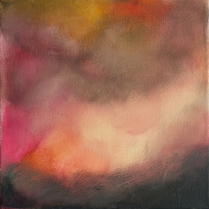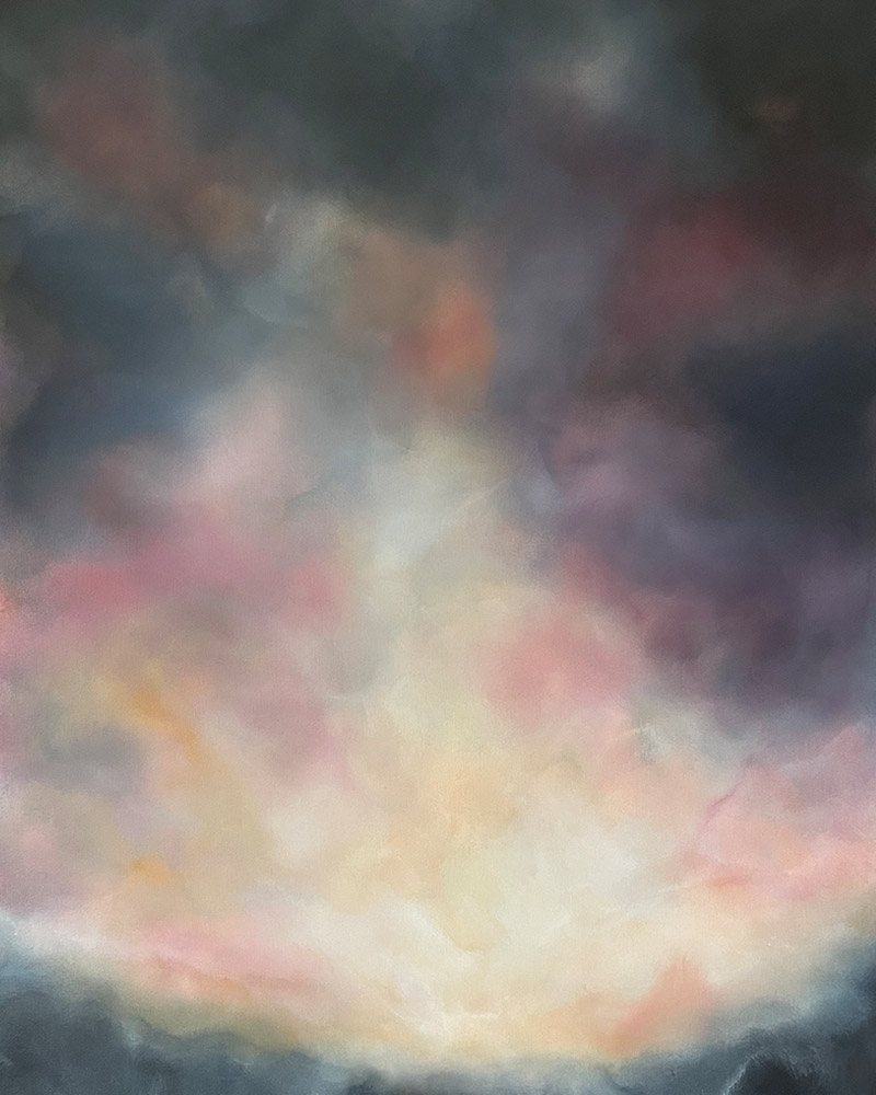 Abstraktes Wolkenbild ‚The Night Comes‘ von Christin von Wels. Eine atmosphärische Himmelslandschaft mit einem leuchtenden Zentrum in Rosa- und Pfirsichtönen, das von dramatischen, dunklen Wolkenformationen in Blau und Anthrazit umschlossen wird.